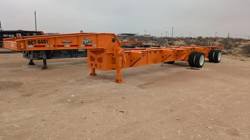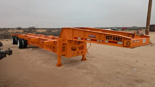 A flatbed trailer with dual axles parked on a dirt lot, with a red and black equipment or machinery mounted on it, under a clear blue sky.